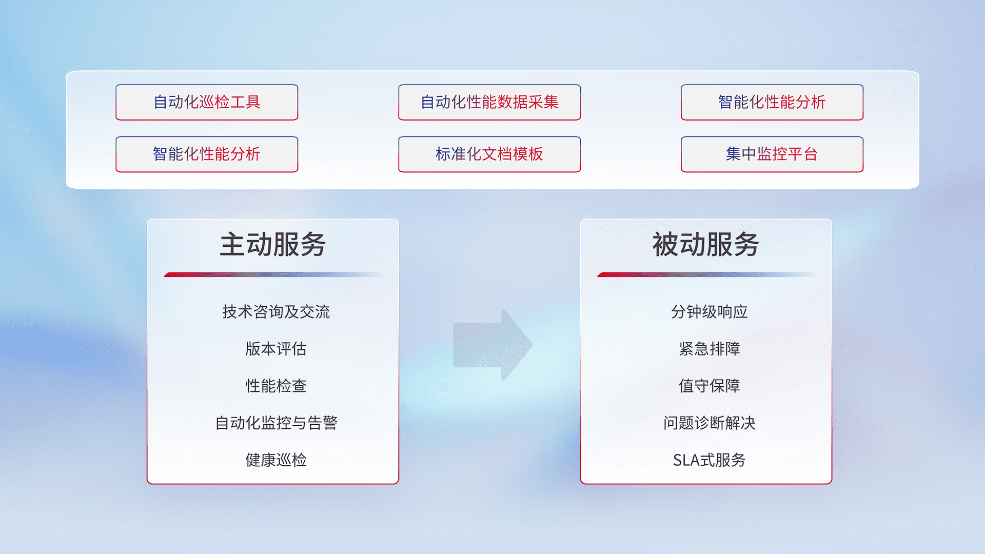 智能化工具和标准化文档,,,保障服务质量,,提供主动服务(包含技术咨询、、版本评估、、、性能检查、、自动化监控与告警、、、健康巡检)和被动服务包含(分钟级响应、、紧急排障、、值守保障、、、、问题诊断解决、、、SLA服务)。。。。